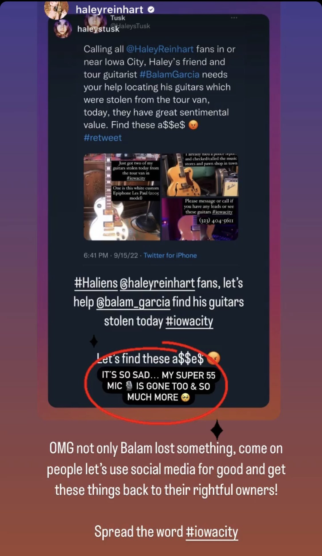 “The trailer to our van got broken into in #iowacity today and someone stole two of my guitars and my backpack with my Green Card (yes I’m an immigrant) and my Mexican passport. It’s a blue and black backpack. They also stole our tour manager’s backpack which is red and black (had his passport in there too) . Both guitars were in black hard cases. If anyone has any leads please message or call me! I really appreciate everyone who has reached out and shared my story so far ❤️ praying these things make their way back to us 🙏🙏🙏”